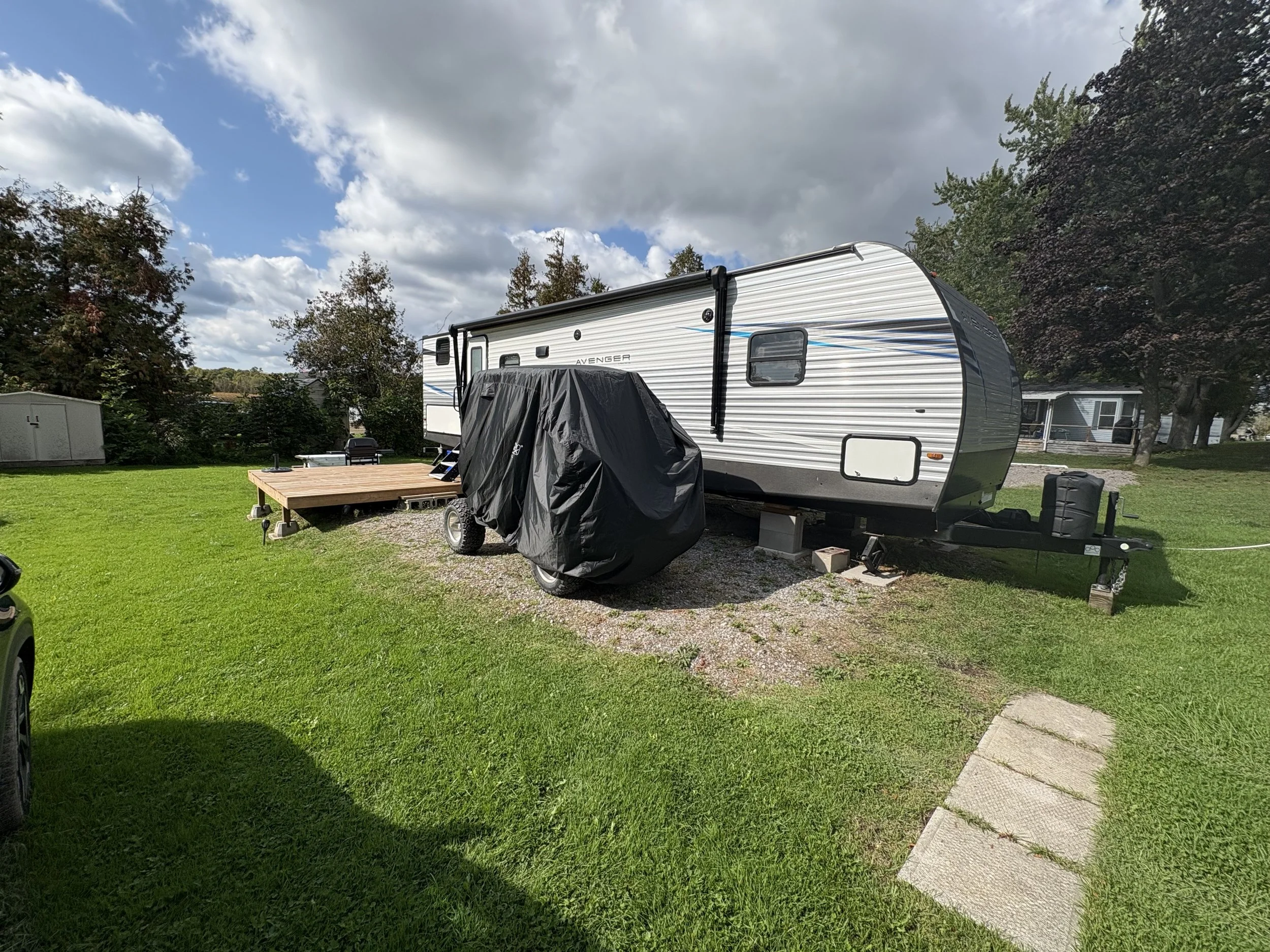 31’ 2-bedroom unit, located centrally within the park. Main bedroom features a king-sized bed. Bunk house has 2 bunks and a fold-out couch. Room for the whole family! Well-maintained lot. Ample storage throughout. Outdoor kitchen with TV.